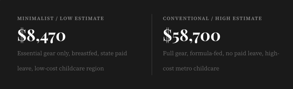 The $50,000 spread between those two figures is not a margin of error โ it is a direct measure of the decisions families make and the circumstances they find themselves in. Childcare geography alone accounts for $19,000 of the gap. Income disruption during leave accounts for up to $15,000. Gear and registry choices account for $4,600. Formula versus breastfeeding, $2,800. Every one of those variables is either partially within a family’s control or at minimum foreseeable โ which is the entire point of building a detailed budget before the baby arrives rather than after.